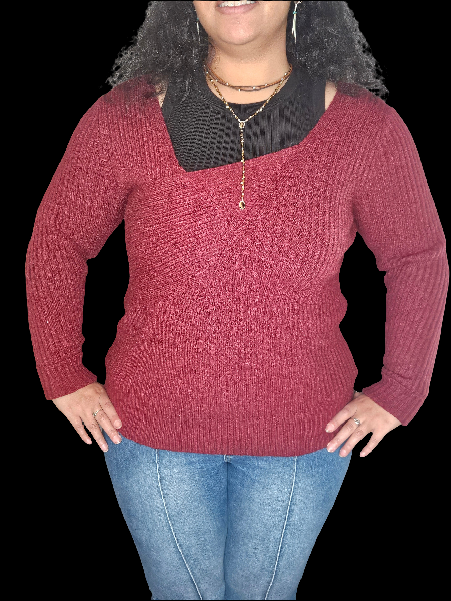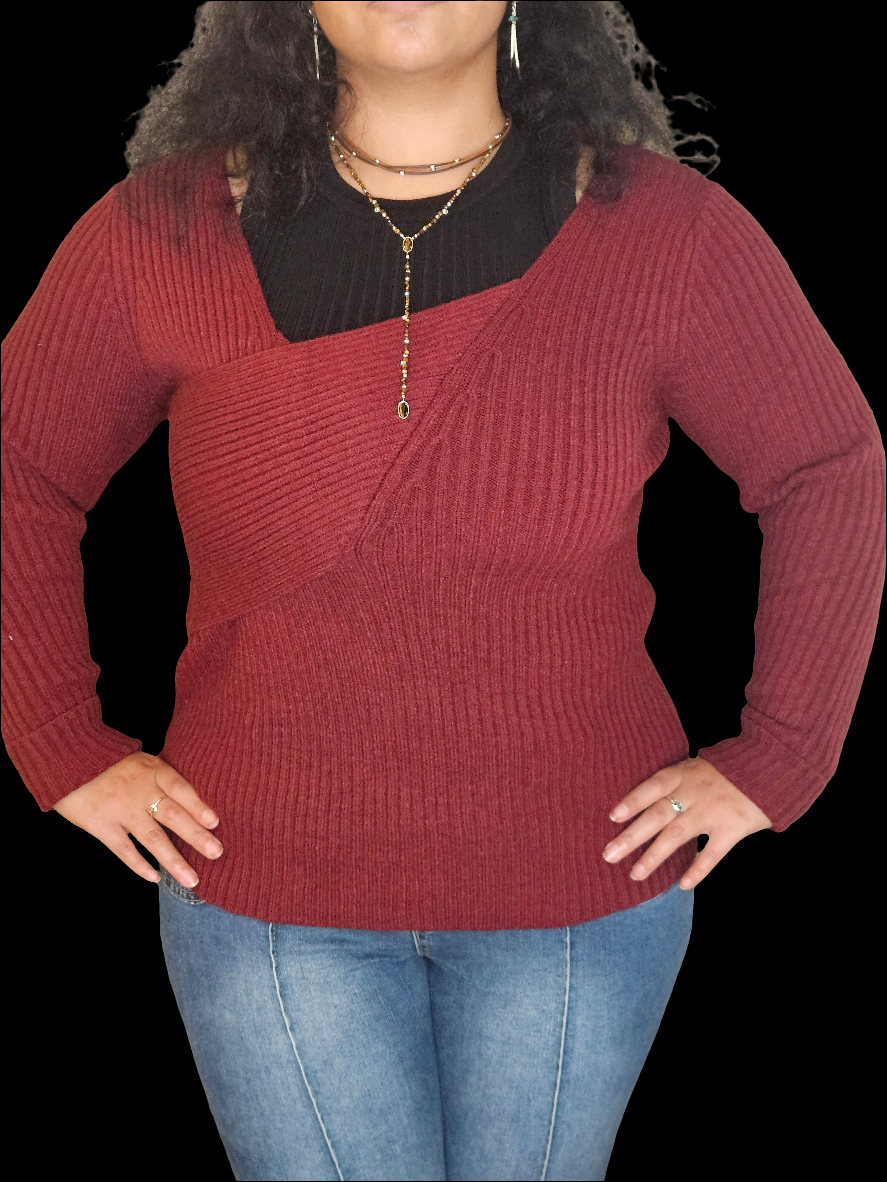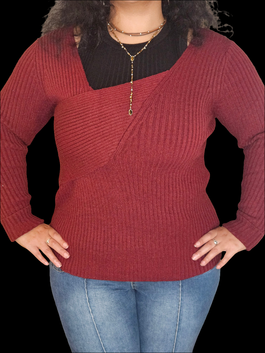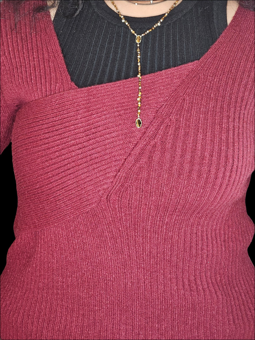 The sweater is a rich burgundy color, featuring a ribbed texture that gives it a cozy and inviting look. It has a unique asymmetrical neckline, with one side slightly draped or layered, adding an interesting design element. The sleeves are long and fitted, contributing to the overall warmth of the garment. The sweater is styled to create a comfortable fit, making it a versatile choice for both casual and slightly dressier occasions. Paired with fitted blue jeans, it creates a balanced and stylish outfit.