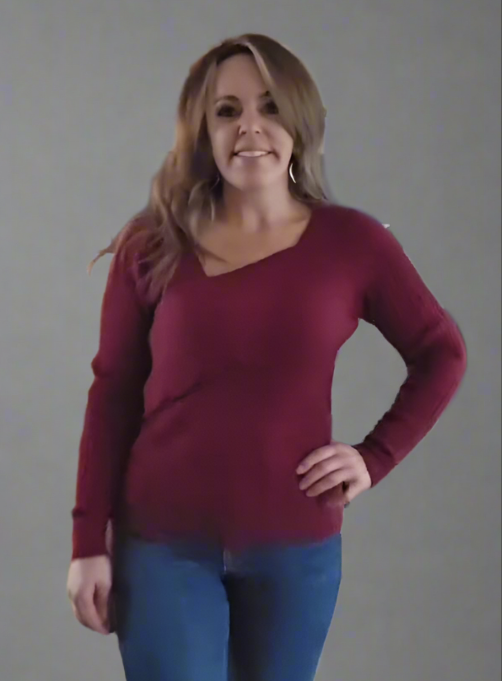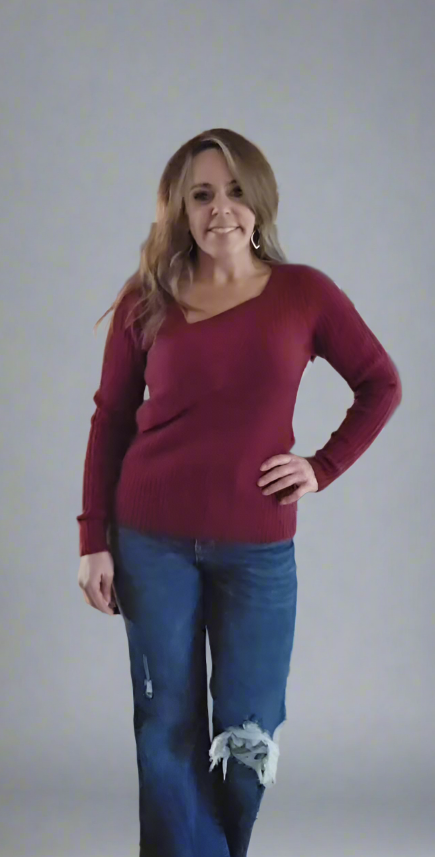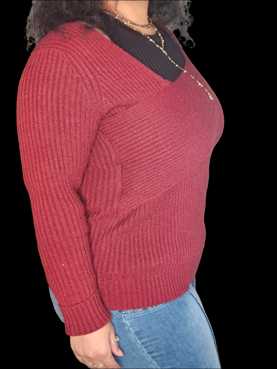 The sweater is a rich burgundy color, featuring a ribbed texture that gives it a cozy and inviting look. It has a unique asymmetrical neckline, with one side slightly draped or layered, adding an interesting design element. The sleeves are long and fitted, contributing to the overall warmth of the garment. The sweater is styled to create a comfortable fit, making it a versatile choice for both casual and slightly dressier occasions. Paired with fitted blue jeans, it creates a balanced and stylish outfit.