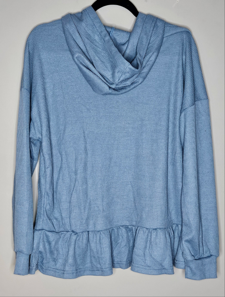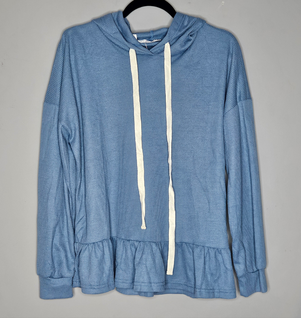 This thermal ruffle bottom hooded shirt combines warmth and style. It features a thermal fabric that provides insulation, making it ideal for cooler weather. The ruffle bottom adds a feminine touch, giving the shirt a playful and trendy look. The hood offers additional warmth and protection against the elements. This type of shirt can be paired with jeans or leggings for a casual yet stylish outfit.