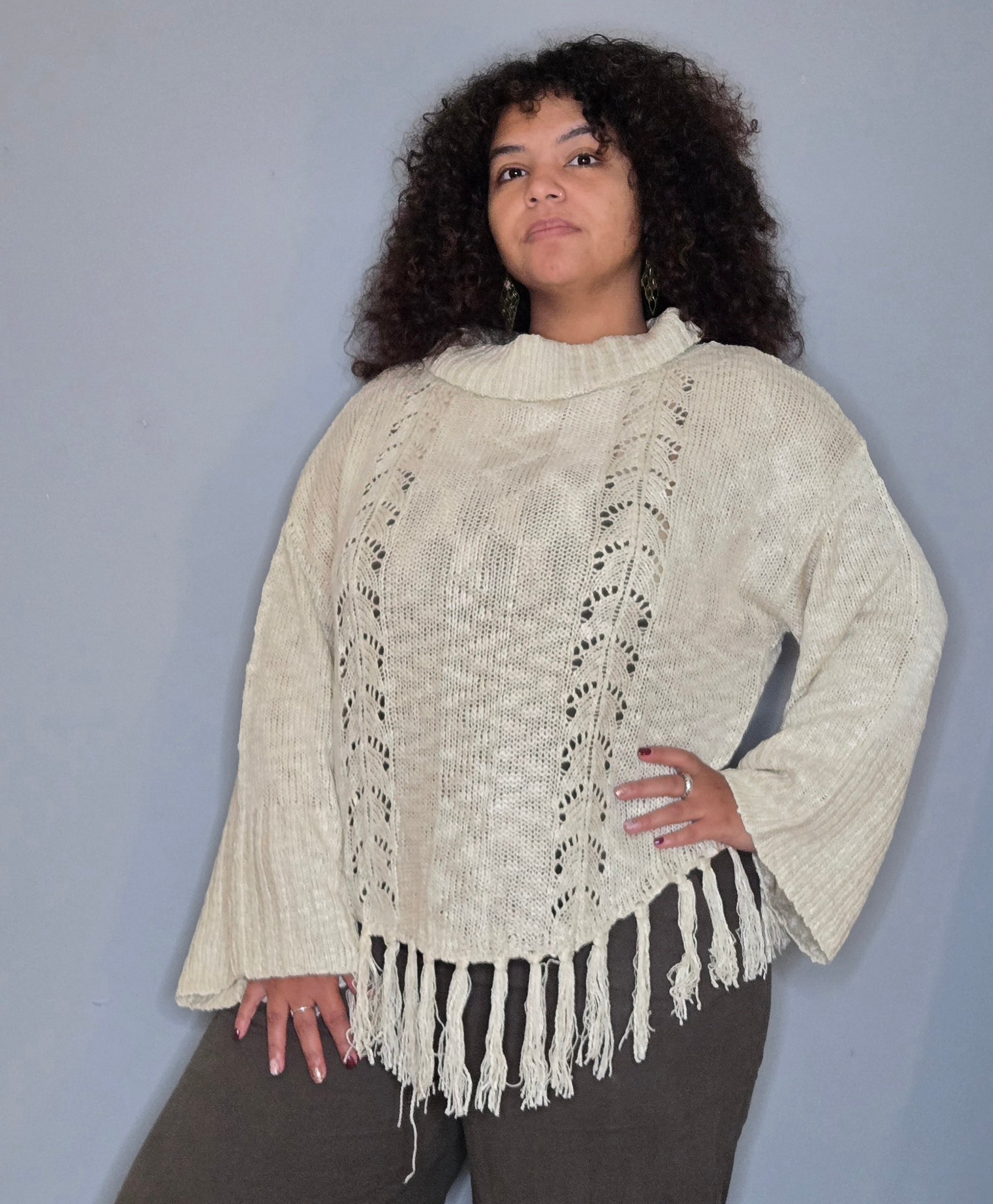 Styling: Paired with dark pants to balance the light sweater; the fringe adds movement and a playful touch.