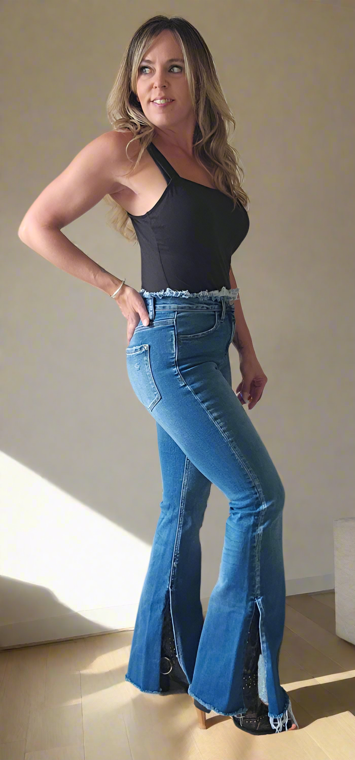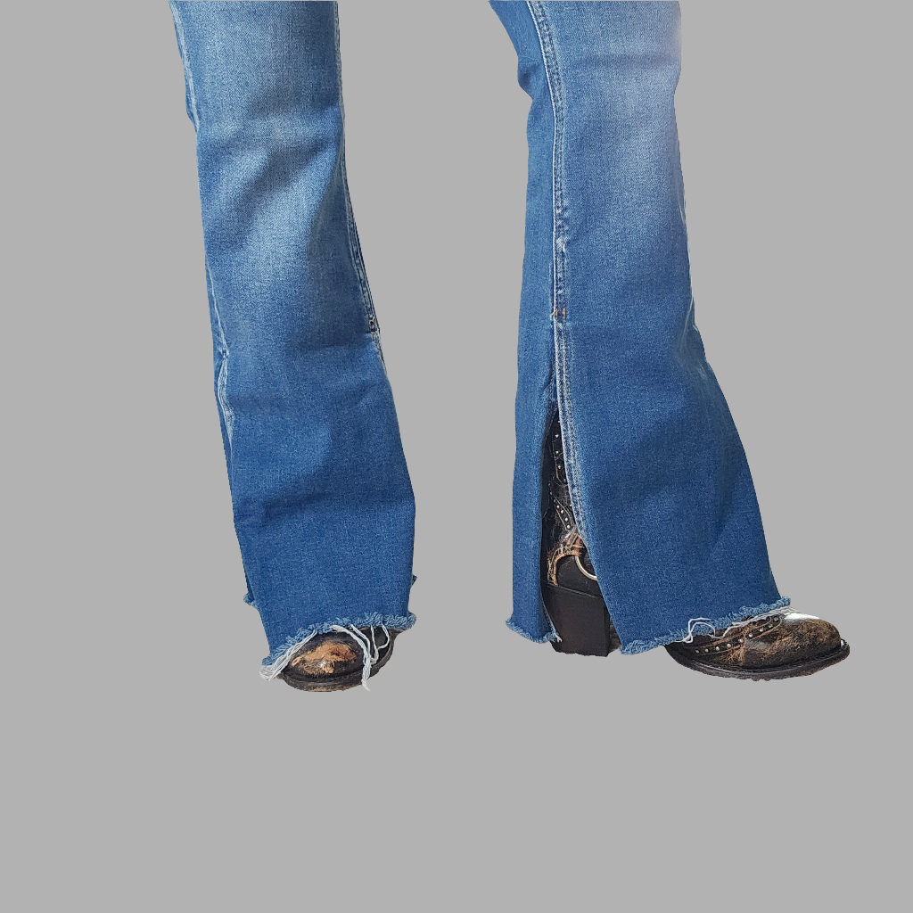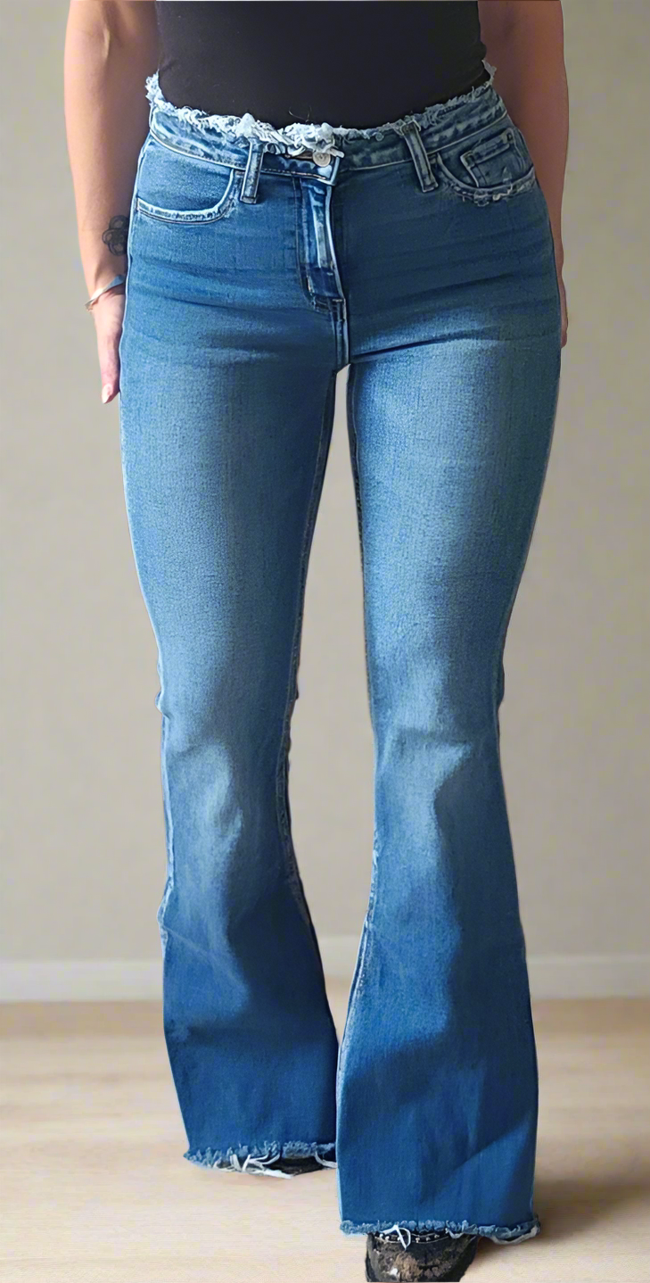 Frayed top jeans with slit flare bottoms are a stylish and trendy choice! This style combines a relaxed, worn-in look with a flared silhouette that adds a touch of retro flair. Here are some styling tips: