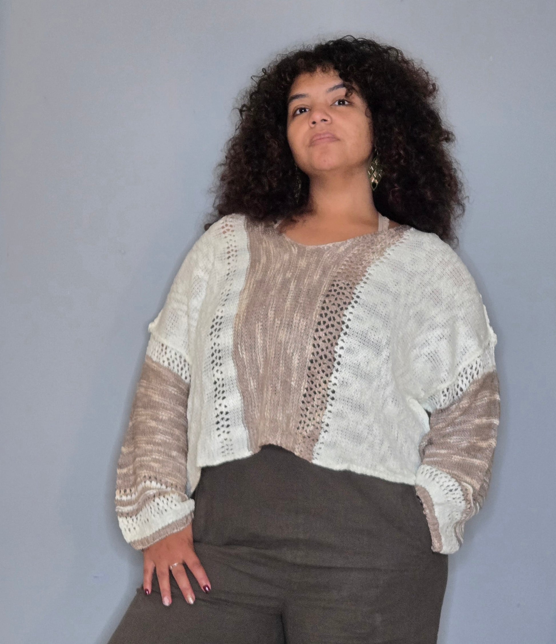 A relaxed, oversized knit sweater with a patchwork, color-block design.