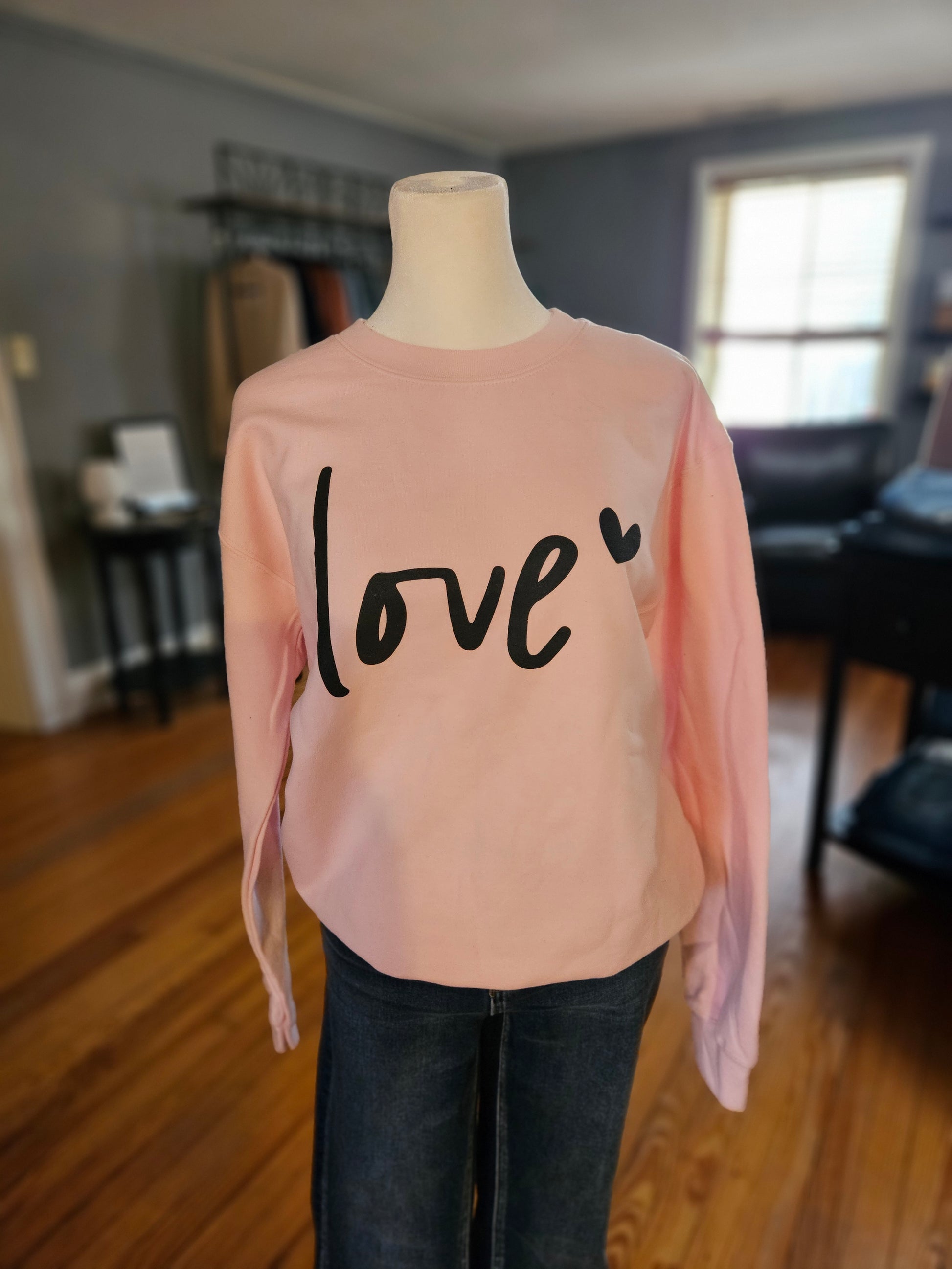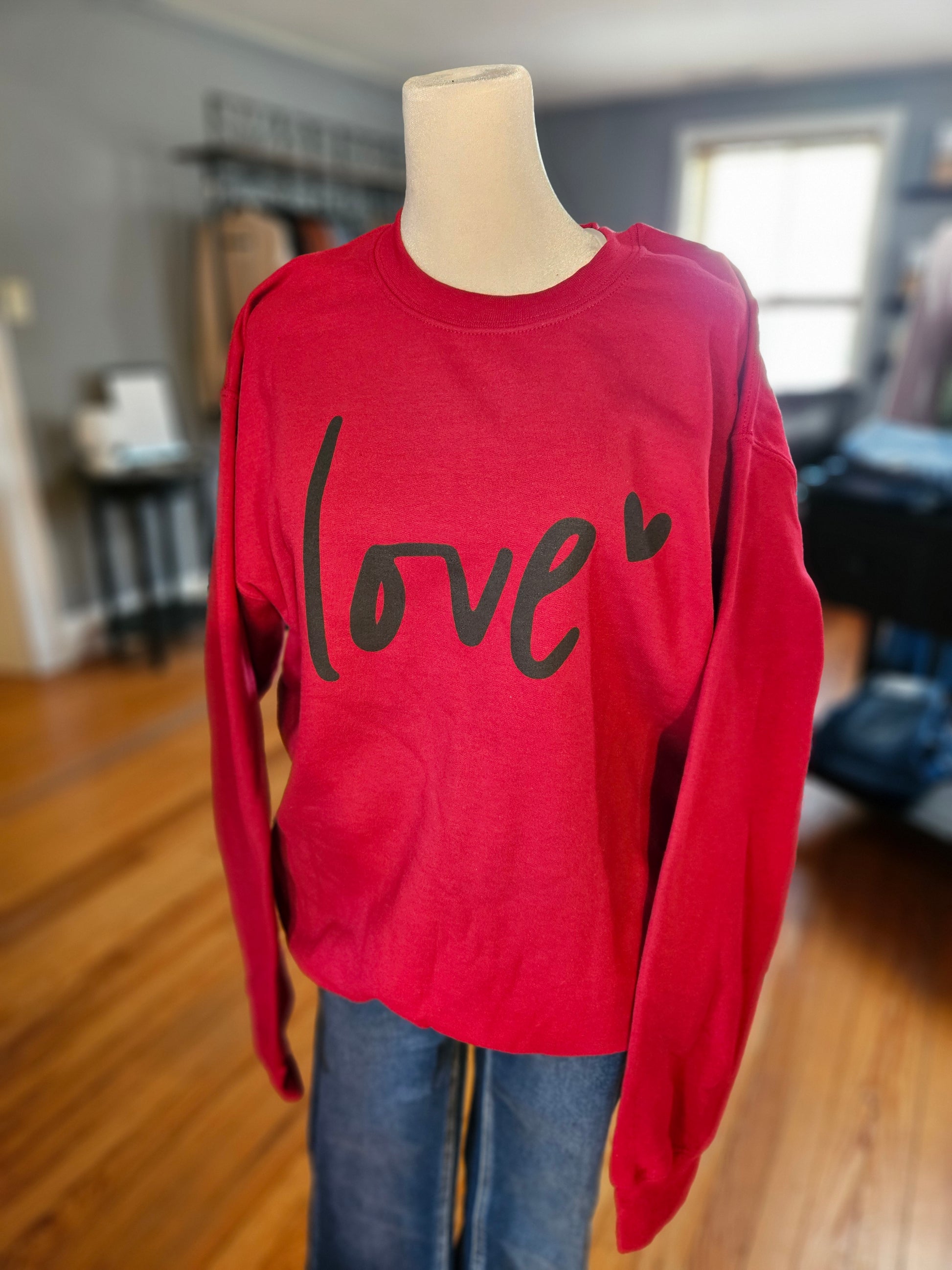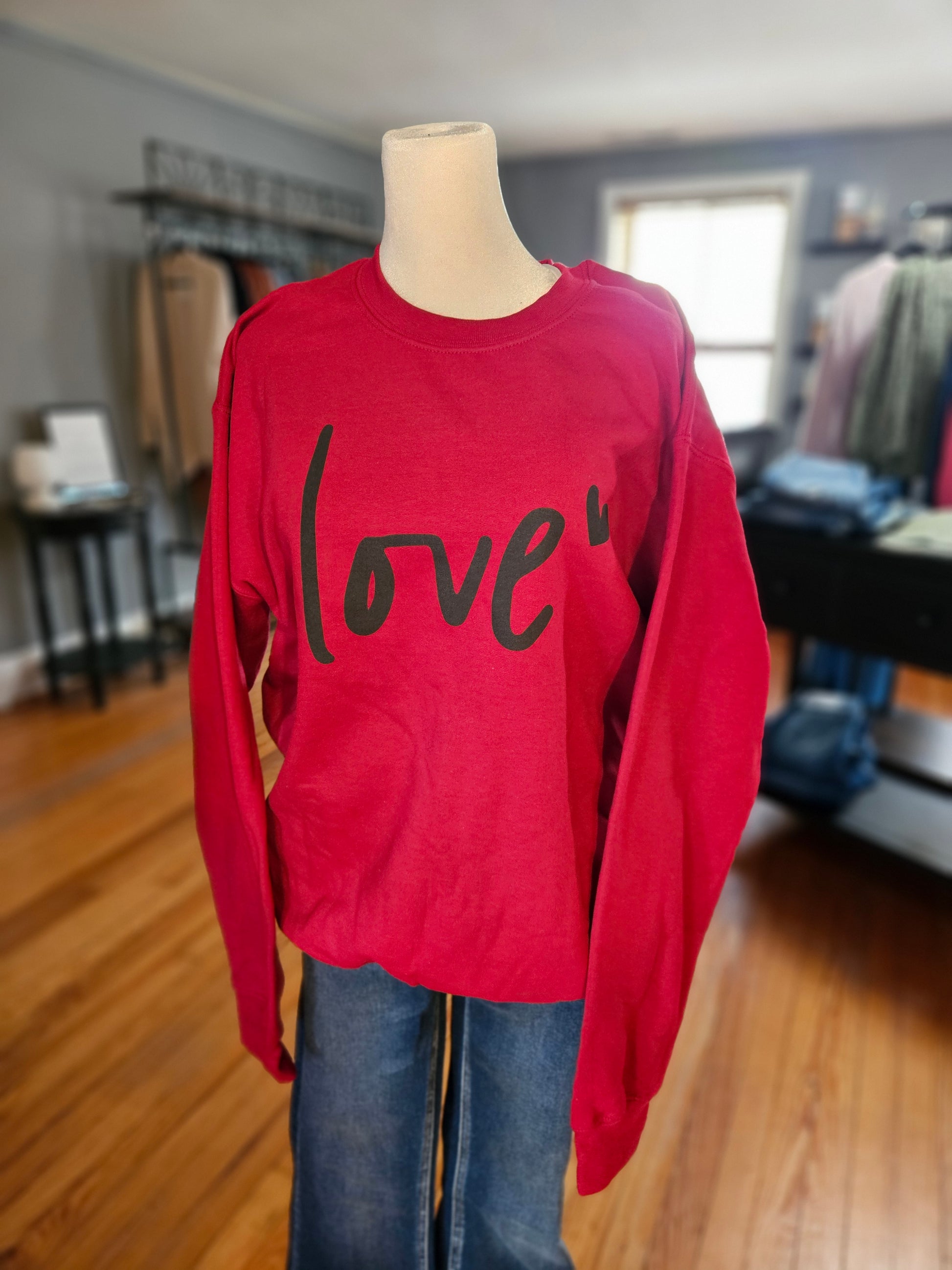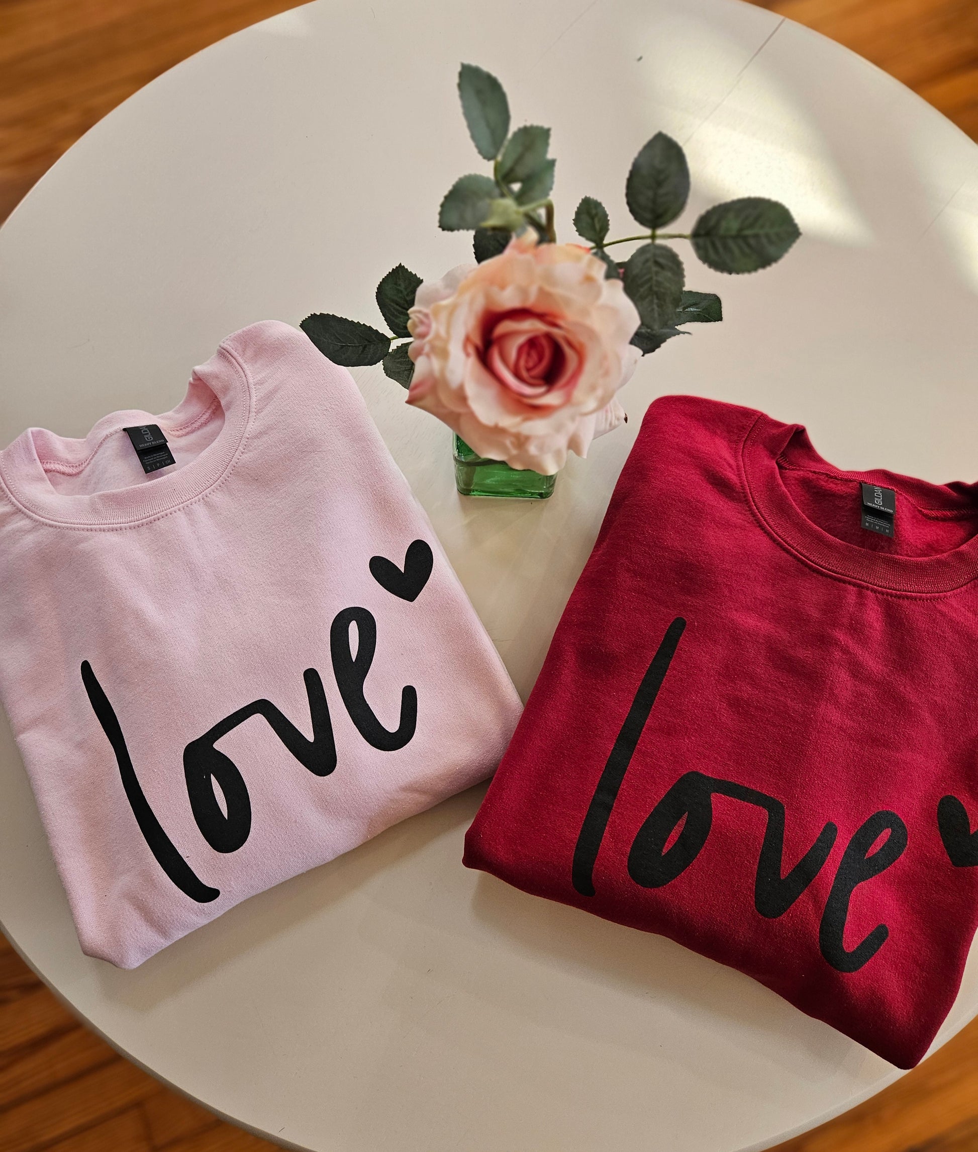 These sweatshirts come in a light pink color or a deep red shade and has the word "love" printed in a bold, black font. The design includes a small heart at the end of the word.