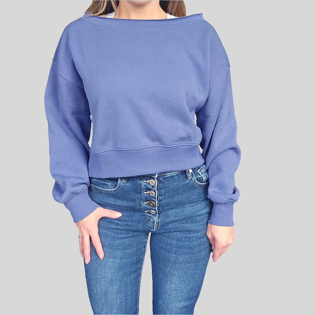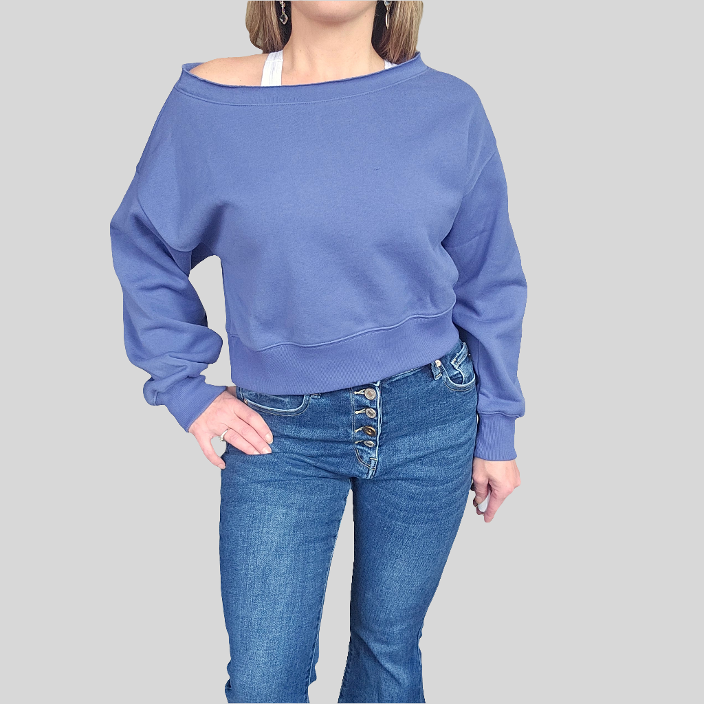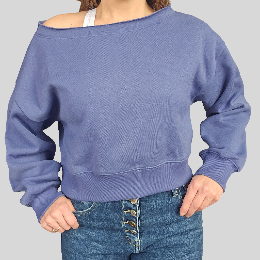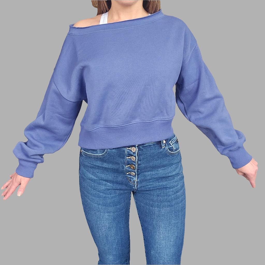The shirt is an oversized, off-the-shoulder style sweatshirt in a soft deep lavender color. It features a relaxed fit with long sleeves and a ribbed hem at the bottom. The casual design gives it a comfortable, laid-back look, perfect for pairing with jeans or casual bottoms.