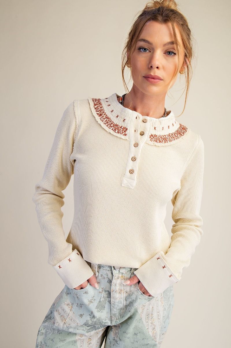 Buttons: A short placket at the chest with three small, round buttons for a subtle, dressed-up touch.