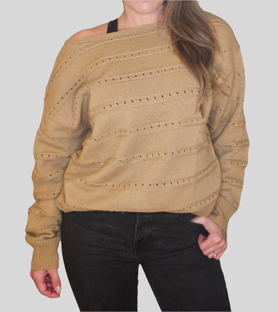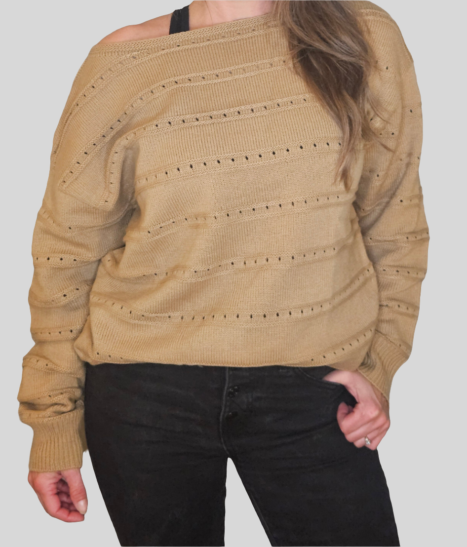 The sweater is a warm tan color, featuring a loose, relaxed fit. It has a wide boat neckline that adds a casual and comfortable vibe. The fabric is textured, with a pattern of open knit stitches that creates a breathable and stylish look. The sleeves are long and slightly oversized, enhancing the cozy feel of the garment. This sweater is paired with black pants, making it a versatile option that can be dressed up or down for various occasions.