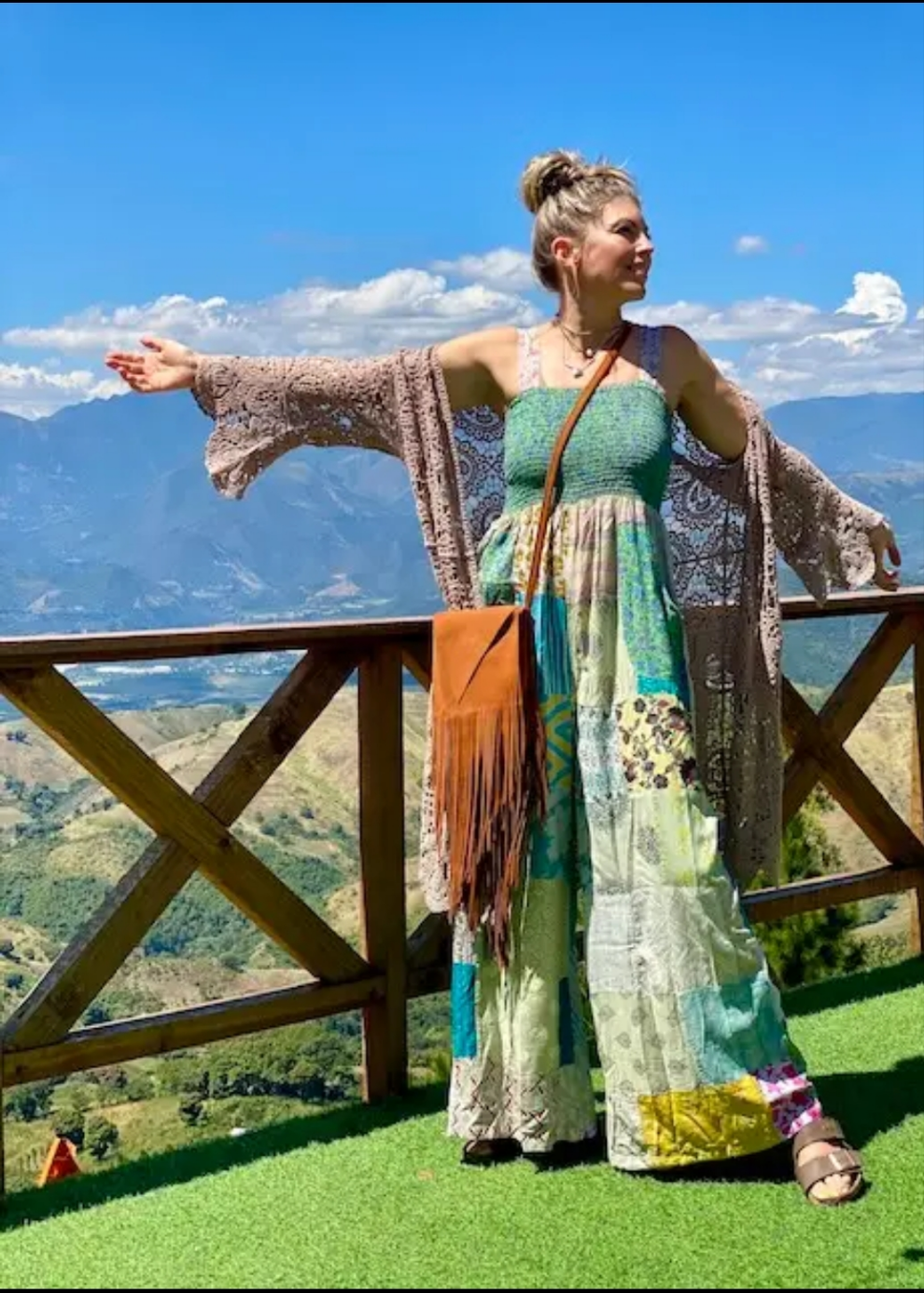 This jumpsuit wide-leg, sleeveless garment featuring a patchwork design with various patterns and colors. It includes shades of beige, orange, yellow, blue, and brown, creating a vibrant, bohemian-inspired look. The patchwork pattern consists of different textures and motifs, such as stripes, floral prints, and geometric shapes, giving it a lively and eclectic appearance. The jumpsuit has a relaxed fit, ideal for a casual, artsy setting.