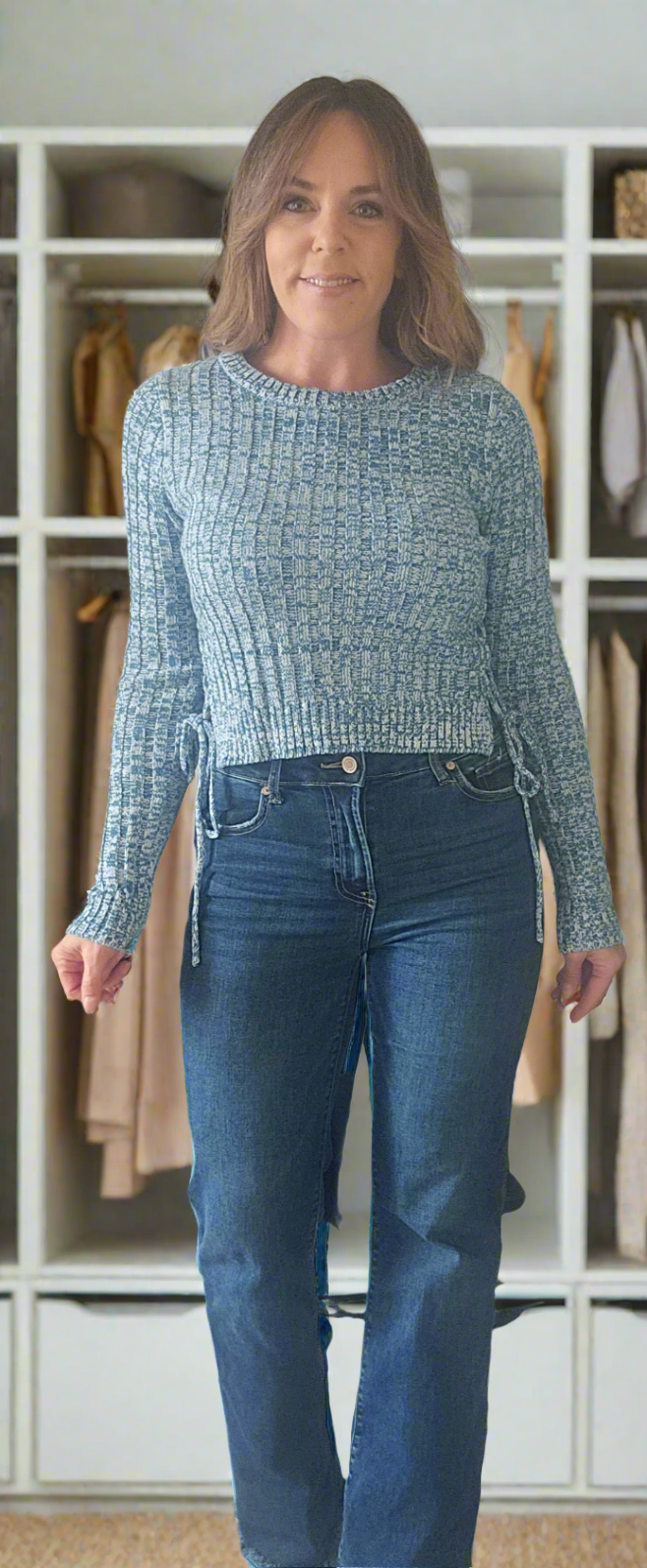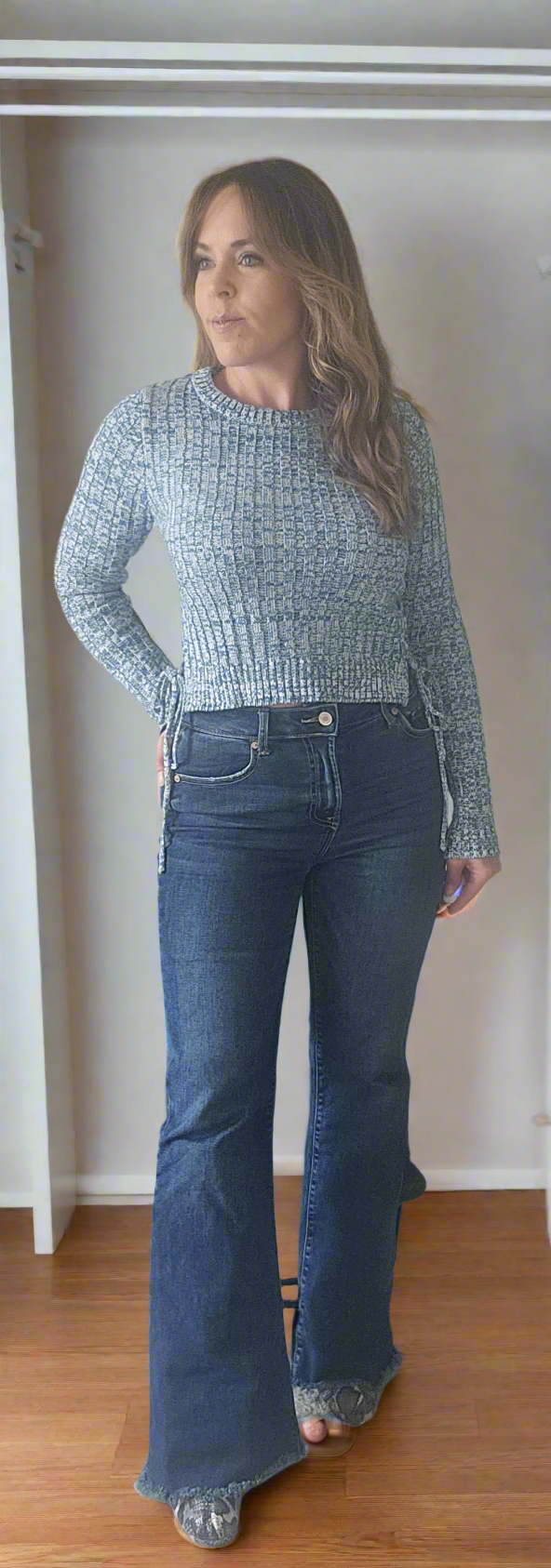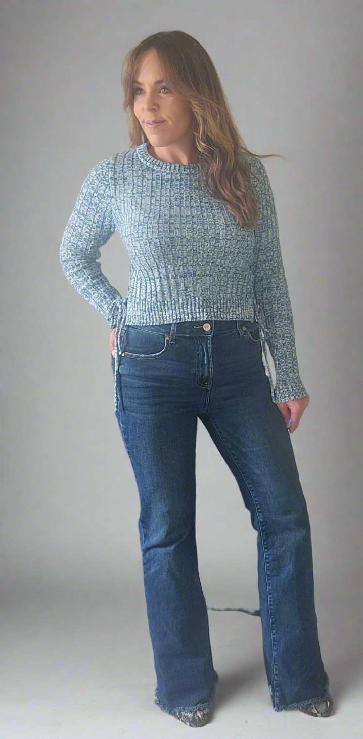 The sweater is a fitted, textured design in shades of blue, featuring a ribbed pattern that adds visual interest. It has a scooped neckline and long sleeves, making it suitable for cooler weather. The model has styled it with high-waisted, flared jeans and a wide belt, which accentuates her waist and enhances the overall look. The outfit combines comfort with a trendy silhouette, perfect for a casual yet stylish appearance.