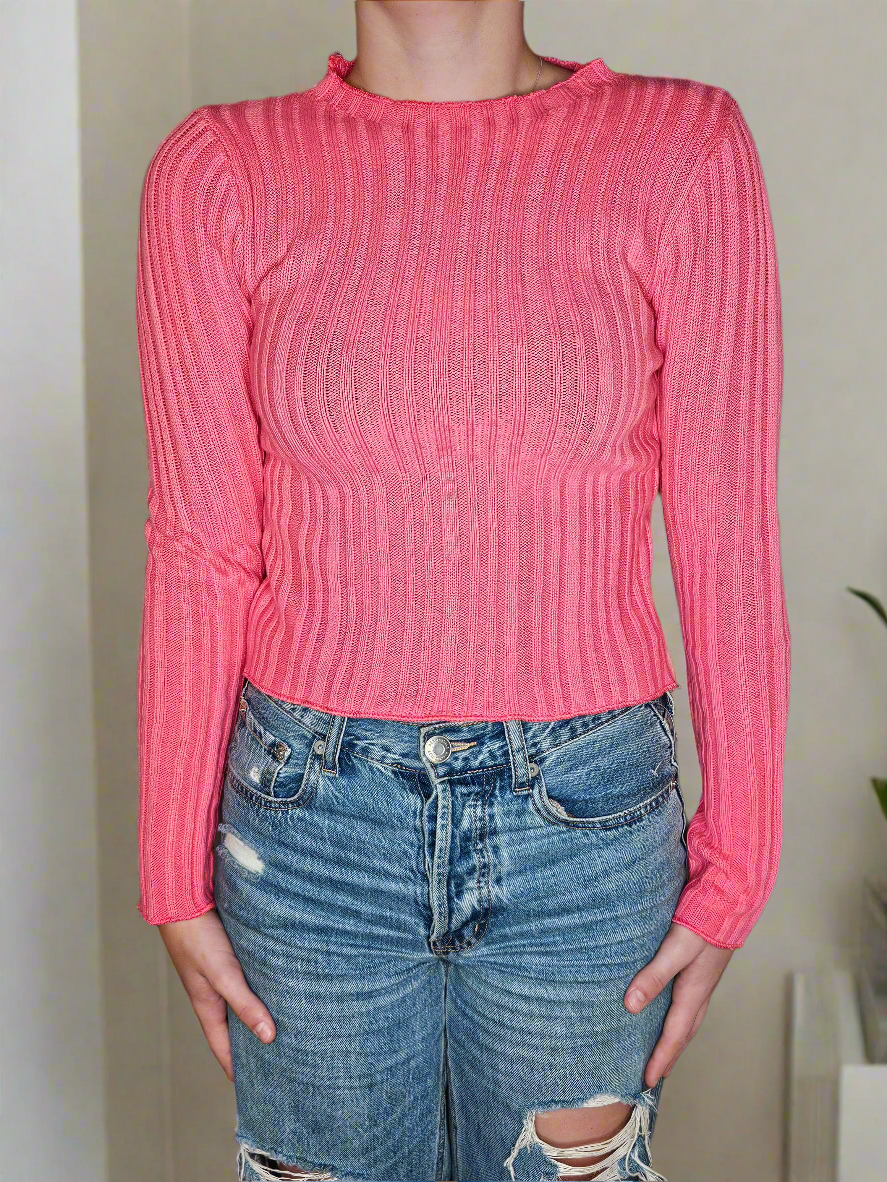 A bold and eye-catching vibrant pink that adds a fun and youthful pop to any outfit, perfect for making a statement. The tight fit hugs the body closely, accentuating the silhouette and providing a sleek, flattering look. This style can be great for layering under jackets or wearing alone. The long sleeves that are fitted throughout, contributing to the overall snug appearance of the sweater.