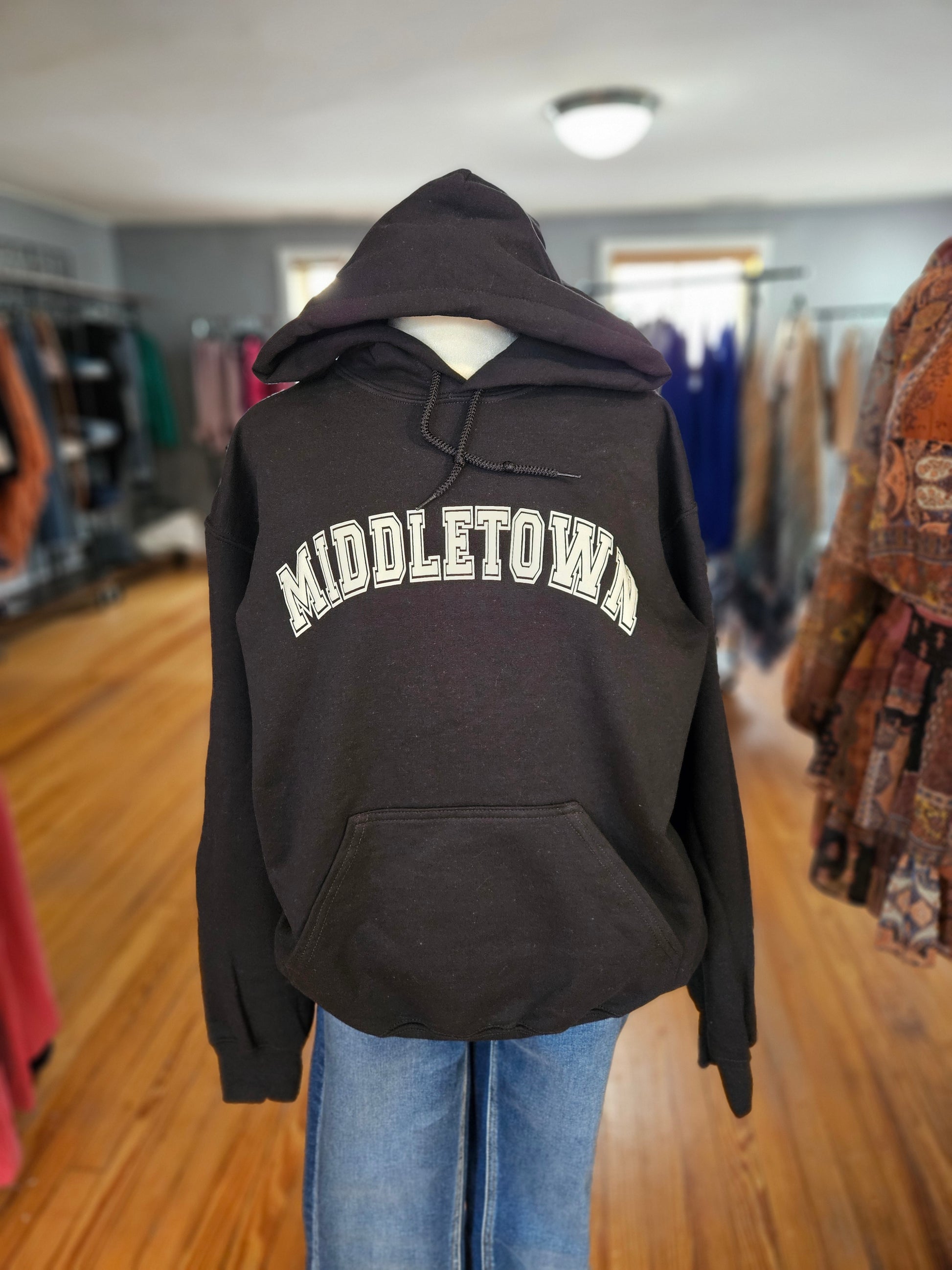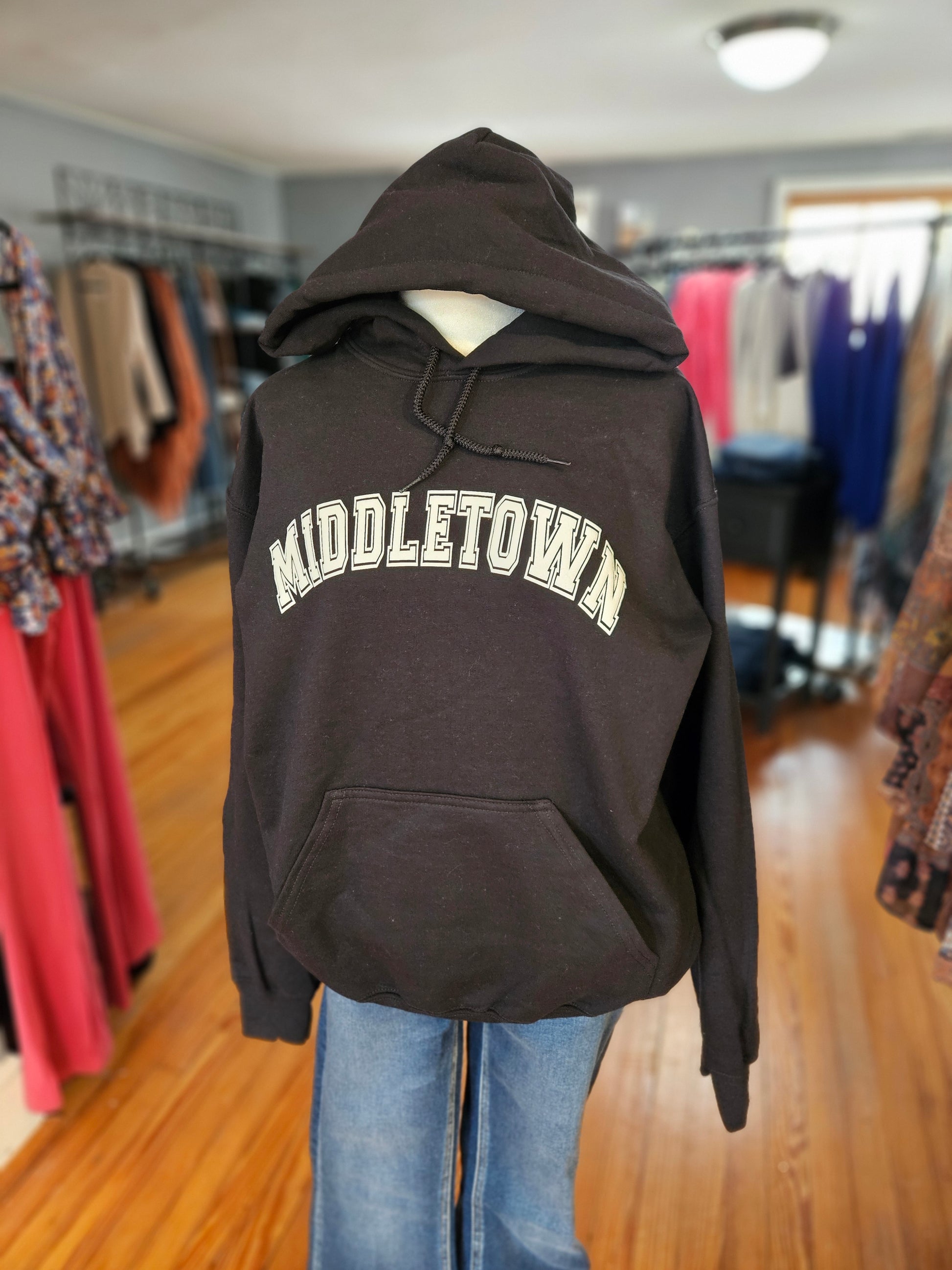 - **Text**: "Middletown" is prominently displayed across the front in a bold, light-colored font, giving it a striking appearance against the black fabric.